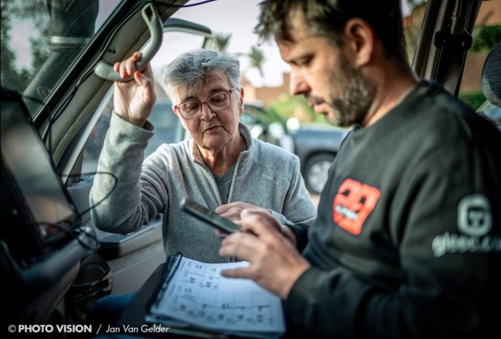 À la queue leu-leu, les concurrents se préparent à s’élancer sur le prologue. Le premier départ est donné à 9h30. C’est le motard # 101 Joris Van Dyck qui se présente sous l’arche. C’est parti, le sable se soulève et la moto disparaît dans un nuage de poussières. Puis vient le tour des SSV, des autos et des camions. En auto, à l’approche du départ, le pilote # 301 Van Den Brink sur Toyota Hilux Overdrive T1+ avait les mains crispées sur le volant, alors que son copilote Bart Van Heun avait les yeux rivés sur son chrono et sa tablette. À cet instant précis, le copilote devient une espèce de coucou qui vit à l’intérieur d’une horloge ! Tic, tac, tic, tac…, c’est parti sur les chapeaux de roues pour une échappée long cour. Une première partie très glissante qui obligeait les pilotes à rester concentrés, surtout sur les 5 premiers km, sur cette piste style WRC sinueuse à flanc de ravin. C’est d’ailleurs à cet endroit, au 4 km que l’équipage SSV # 219 André Thewesssen / Arjan Van Tiel part en galipette sur plusieurs tonneaux et atterrit à 10 mètres plus bas.