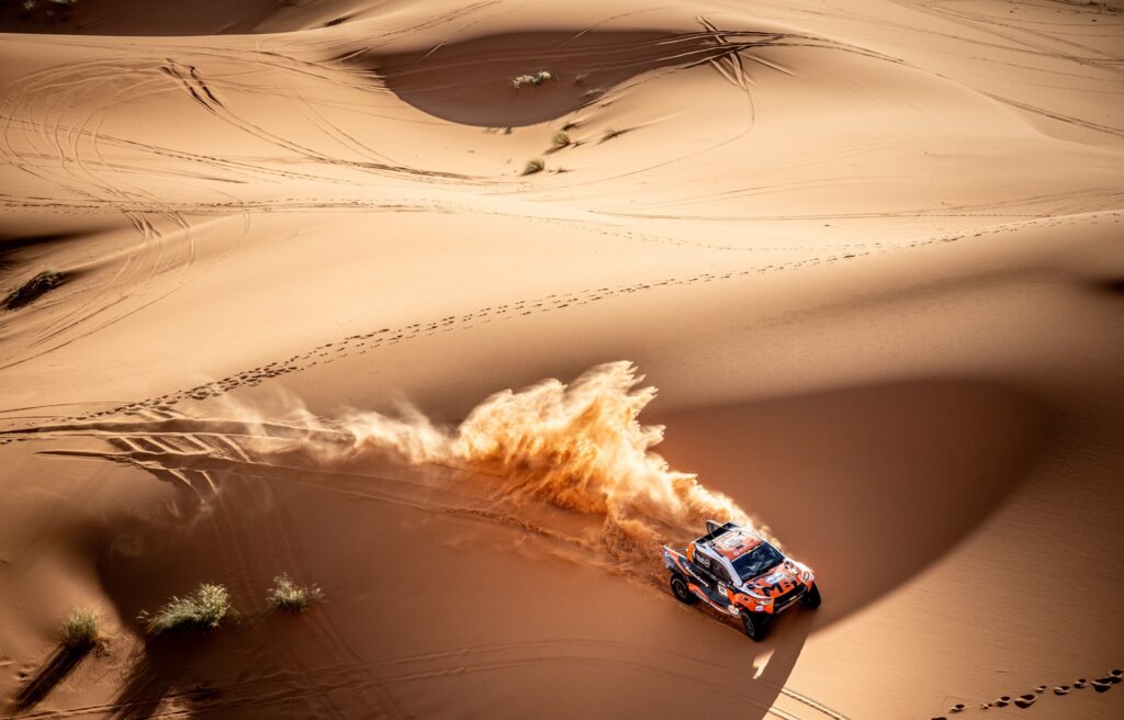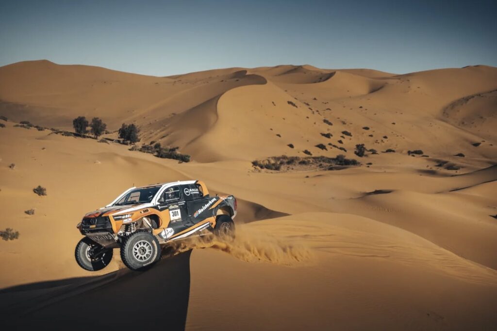 ES6. 345 km. Boucle Merzouga/Merzouga. Mais, qui va dynamiter le grand champion ? L’étape reine du Morocco Désert Challenge 2026 a été complètement modifiée dans la nuit, puisque les hélicoptères ne pouvaient toujours pas survoler l’espace aérien proche de l’Algérie. Des ordres qui sont venus du plus sommet de la pyramide militaire. En attendant, les paupières étaient lourdes, mais le moral était au beau fixe puisque Gert Duson pouvait enfin souffler. Au programme, dix km de dunes, du roulage rapide sur des plateaux, avec du hors-piste (HP), du sinueux avec de la végétation derrière Erfoud. C’est encore sous un soleil bleu azur que le premier motard s’élance sur une piste drapée de poussières qui voltigent dans le ciel. Côté autos et SSV les pilotes français étaient remontés comme des coucous ! Ils sont des petits gars ténébreux et courageux, qui ne font pas partie des grosses écuries, qui n’ont pas de gros moyens, mais qui ont du cœur au ventre. Entre les deux leaders dans la catégorie autos et SSV, c’est la réponse du berger, à la bergère. Qui ira chercher aujourd’hui le grand champion ? nommé Mitchel Van Den Brink ? : Rizzardi, Besson, Thijs, Chesneau, Van Loon, Hofstra ou le Taurus de Wevers ? Comme ils ont tous une solide connaissance du terrain africain, il est compliqué de dire qui s’imposera aujourd’hui. De toute façon, c’est ça le rallye-raid, des histoires d’hommes et de femmes avec des moments qui marquent leur existence. Après 30 mn de course dans le tronçon de dunes, sans surprise, du côté de Rissani, le Hilux Overdrive # 301 de Van Den Brink enclenche la troisième, laissant derrière lui une horde sauvage prête à tout pour passer à l’abordage.