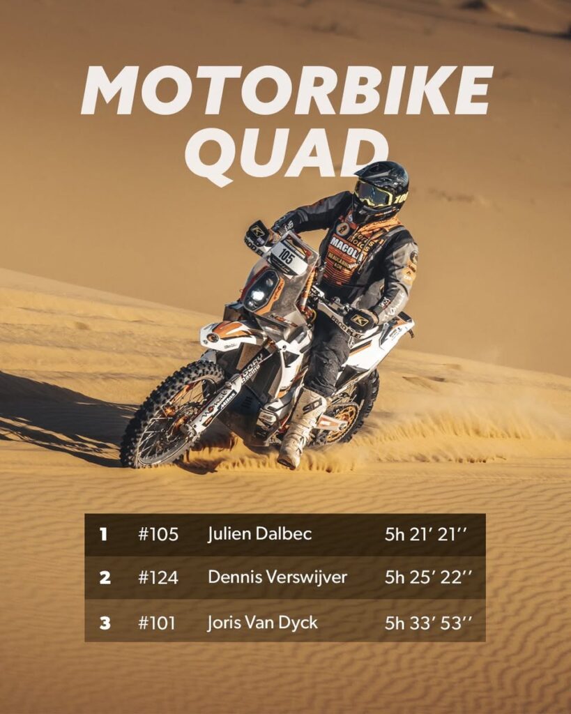 Espérons voir plus d’équipages français sur la prochaine édition, car beaucoup d’entre eux sont capables de rivaliser avec les forces qui étaient présentes, et tout particulièrement contre l’armada hollandaise. Un pari réussi par Gert Duson et Jean-Claude Kaké pour avoir récompensé tous les rescapés en vainqueurs. Notons la remarquable performance des équipages français. Dans la catégorie moto, le # 105 Julien Dalbec monte sur la première marche du podium avec sa KTM 450 RR.