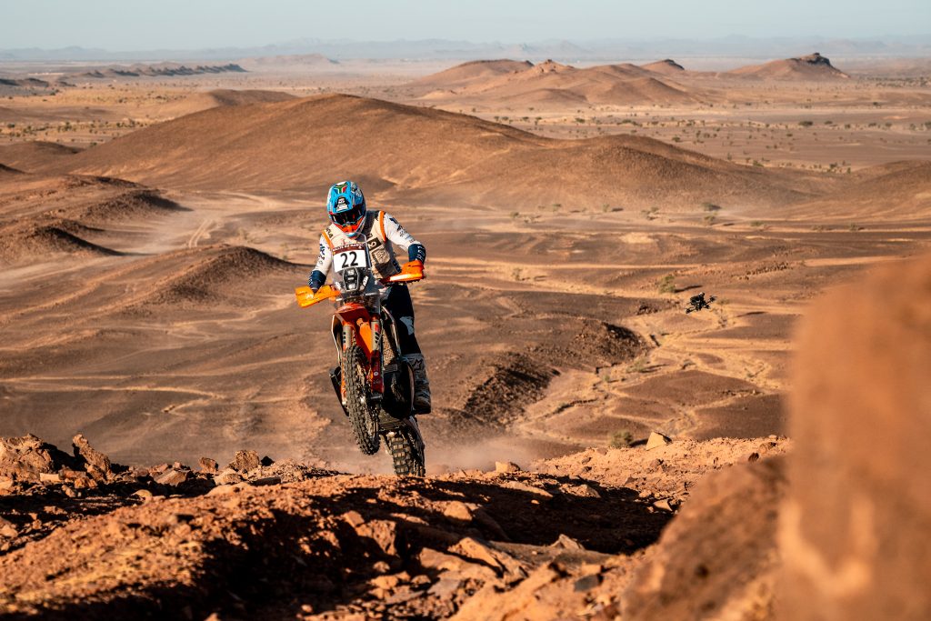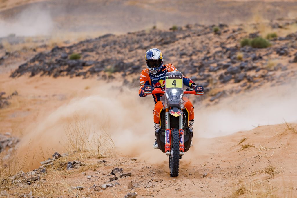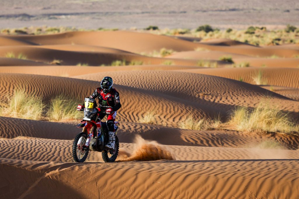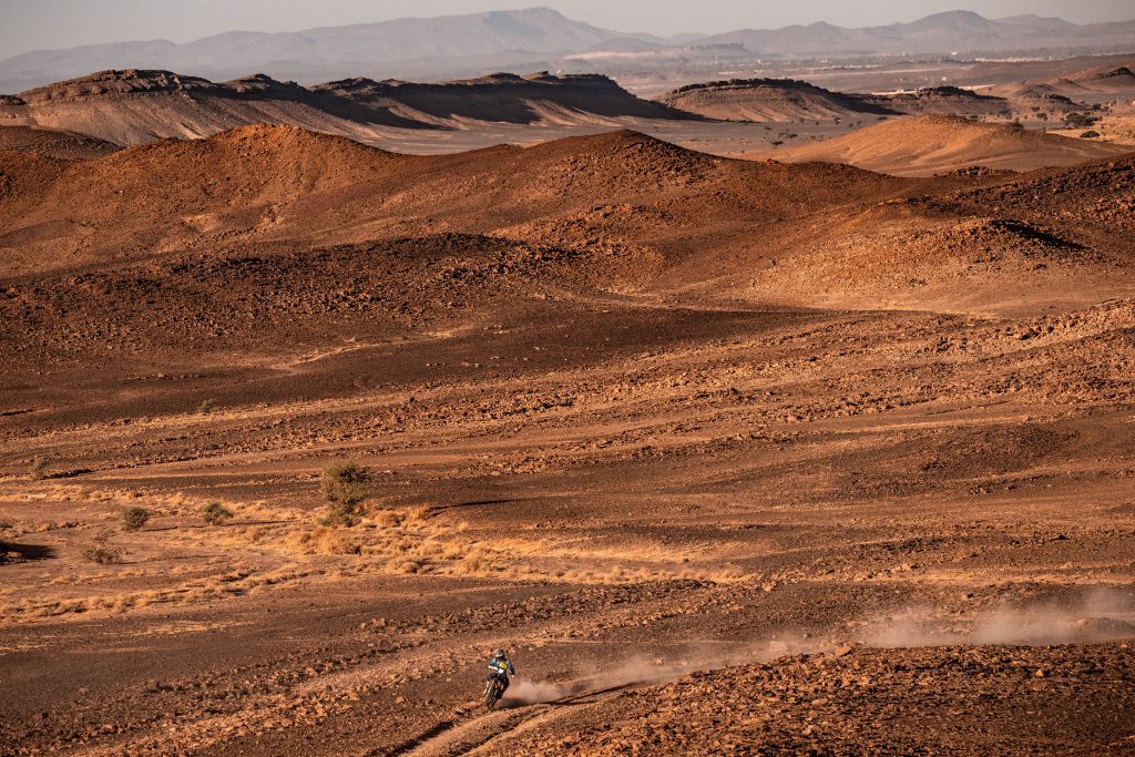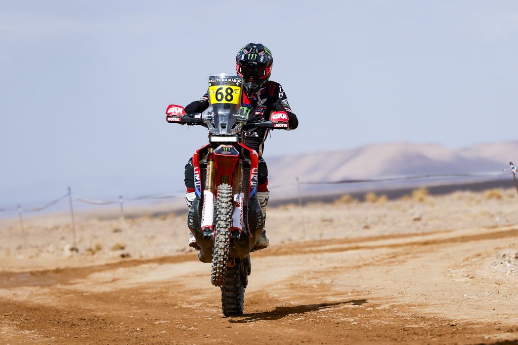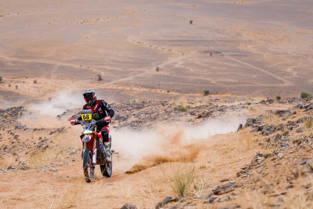 ES2. 13 octobre. Fès / Erfoud 779 km, dont 298 chronométrés. # 9 Ricky Brabec. Honda, n’a pas profité de sa victoire du prologue. Mal parti en début de spéciale, l’Américain n’a jamais été dans le coup. Finalement, c’est le pilote # 4 Daniel Sanders qui a été le plus rapide du début à la fin de la spéciale, suivi au chrono par Edgar Canet, son coéquipier engagé en catégorie Rally2. Coup de théâtre, au km 219, # 77 Luciano Benavides chute et est obligé d’abandonner sur blessures. À l’arrivée de la spéciale, Chucky remporte sa 4e victoire sur le Rallye du Maroc. Ross Branch sur Hero, complète le podium du jour. Au général, Sanders prend les commandes avec 1’35’’ d’avance sur son coéquipier espagnol. L’abandon de Luciano Benavides réduit à néant l’espoir d’une marche sur le podium au Championnat du Monde.